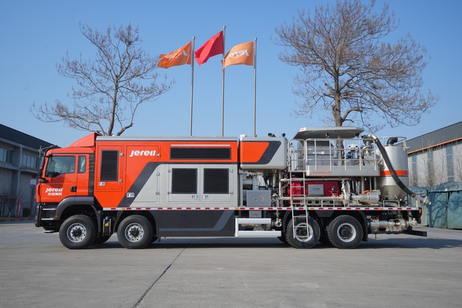 全工况电驱固井装备搭载杰瑞自主研发的盘古系列柱塞泵,实现整机性能跃升30%,以更大排量、更高压力、更强动力的硬核实力,从容应对超深井、复杂地层的固井挑战,为能源开发提供更高效、更强劲的装备支撑。