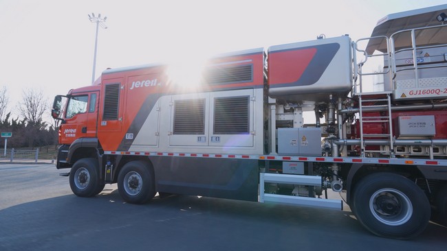 杰瑞全工况电驱固井装备搭载新国标大倍率超充电池,30分钟即可实现极速补能。配备500kWh以上高能量电池,并集成增程系统,可满足固井、转井等连续作业需求,充电效率较行业常规水平提升 50% 以上。产品动力响应迅捷,符合高等级安全标准,可从容应对油田复杂严苛工况,为现场作业提供便捷省心、持续稳定的能源保障。