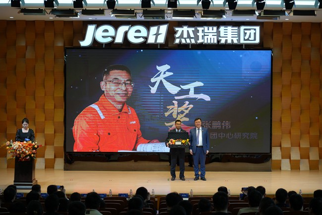 本次大会,隆重颁发了重大专利入围奖、年度发明人奖、科技进步奖及天工奖等奖项。其中,备受瞩目的“天工奖”为创新人才颁发了个人定制版价值13万元的劳力士手表以及10万元现金激励,这一重磅奖励不仅是对获奖者在研发战线上做出突出贡献的最高褒奖,更是杰瑞对奋斗者“付出必有回报”承诺的生动践行。随后,本届天工奖获得者集团中心研究院院长张鹏伟先生分享了正向研发体系的建立历程,号召全员通过解决实际问题建立对正向研发的信任,相信“相信”的力量。