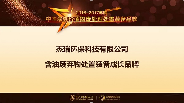8月25日,由E20环境平台、上海城投共同主办的“2017(第五届)城市垃圾热点论坛”在上海召开,论坛上公布了“2016-2017年度中国最具价值固废处理处置装备品牌”,杰瑞环保科技有限公司荣获“中国最具价值固废处理处置装备品牌—含油废弃物处置装备成长品牌”。