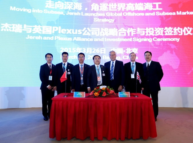 北京时间2015年3月26日,杰瑞集团与英国Plexus公司在北京第十五届中国国际石油石化技术装备展览会(CIPPE 2015)现场举行战略合作与投资签约仪式,双方致力于未来共同开拓高端海工市场,而杰瑞也因此成为中国首家水下井口设备供应商,为世界海洋油气开发提供安全可靠的解决方案。