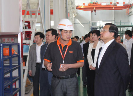 2012年5月19日,山东省副省长才利民在烟台市商务局局长于东及莱山区委副书记、区长姚秀霞等领导的陪同下视察杰瑞工业园。