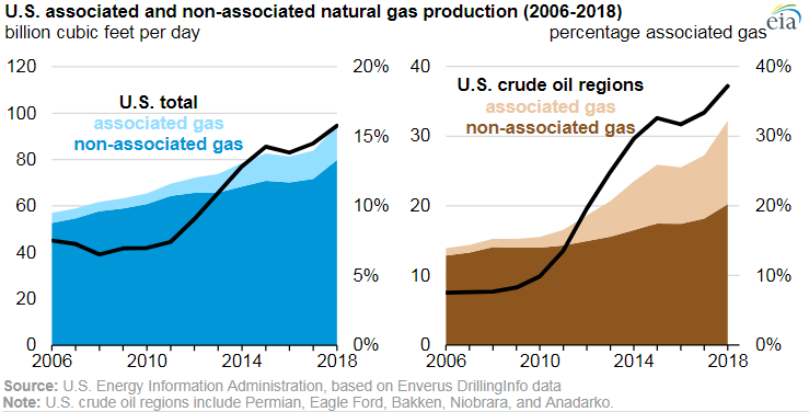 The increase of natural gas production is partly supported by a rising associated gas output in the past year. According to E. Geary and J. Perrin (2019), associated natural gas production in the U.S. grew from 4.3 Bcf/d in 2006 to 15.0 Bcf/d in 2018. In the meanwhile, the share of associated gas in total natural gas production ascended from 8% to 16%